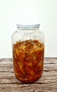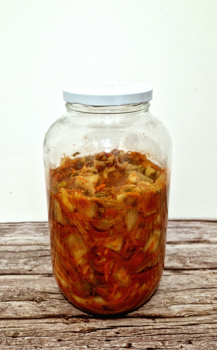- Az átmosott, lecsepegtetett kínai kelt összekeverjük a tisztított, darabolt zöldségekkel és a lisztes-gyömbéres-chilis masszával. Alaposan átkeverjük és 5 l-es dunsztos üvegbe tesszük, közben a zöldségeket jól lenyomkodjuk.